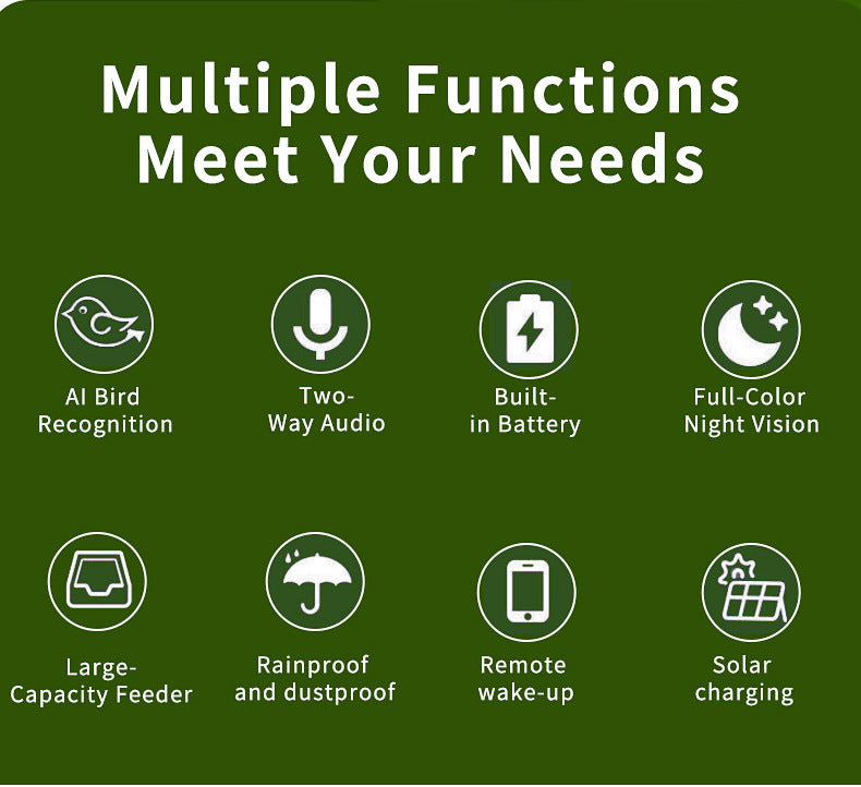 AI Bird Recognition & Smart Alerts — Built-in AI recognizes bird species when they land to feed, triggering instant notifications via companion app. Perfect for bird lovers, nature watchers, and wildlife enthusiasts.